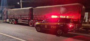 A apreensão ocorreu após os policiais constatarem que um caminhoneiro apresentou uma documentação fiscal falsificada, durante a abordagem de uma carreta bitrem, carregada com 36 toneladas de chapas de granito.