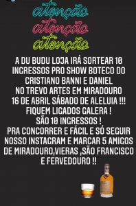 Cidade Destaque 4 A Loja Du Budu vai sortear ingressos para o Show Buteco da dupla Cristiano & Daniel 12 de abril de 2022 By: miradouronotícias.com.br