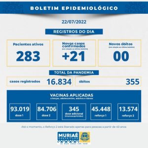 Muriaé teve 21 novas confirmações de covid registradas nas últimas 24 horas. O total de pacientes ativos caiu, somando agora 283 pessoas.