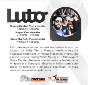 “Com imenso pesar que comunicamos o falecimento de Samantha Kelly Vieira Mendes (enfermeira na Fundação Hospitalar Dr. Moisés Magalhães Freire), seu esposo Brenno Hanfery Vieira Mendes e o filho Miguel Vieira Mendes. Nesse momento de dor a Prefeitura de Pirapora e a Fundação Hospitalar solidarizam com todos os familiares e amigos e expressam as mais sinceras condolências pela perda.”