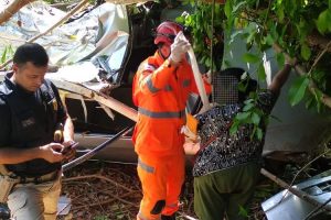 O veículo ainda se chocou fortemente em uma árvore, o que dificultou ainda mais o resgate dos socorristas.