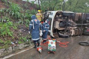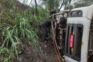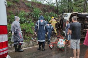 O caminhão com placas de Juiz de Fora saiu de Serra-ES. Chovia muito no momento do acidente. A pista precisou ser parcialmente interditada, mas não houve registro de engarrafamento. O veículo e a carga serão retirados por um guincho nas próximas horas. A Polícia Rodoviária Federal registrou o acidente.