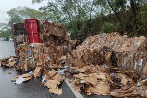 Caminhão carregado de papelão tomba na BR-356, próximo a Pedreira e mulher fica gravemente ferida