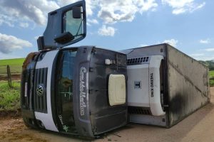 Um caminhão carregado de carnes tombou na BR 356, na ponte da Embaúba, na tarde desta quinta-feira (10). O motorista não se feriu e dispensou atendimento do Corpo de Bombeiros.