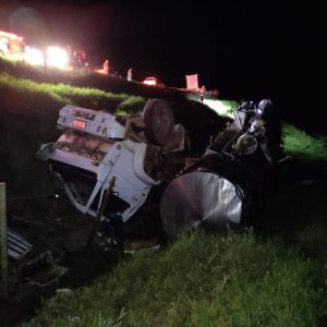 Um caminhão tanque carregado de leite tombou na BR-356 próximo a ponte da Embaúba na noite desta sexta-feira (18) e o motorista acabou falecendo no local.