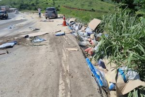 A Polícia Rodoviária Federal está no local registrando e controlando o transito já que parte da carga ficou espelhada pela rodovia, juntamente com a Pericia técnica da Policia Civil que realiza os levantamentos e liberação do corpo da mulher para o IML.