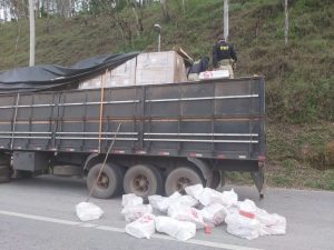 Durante abordagem do veículo, foram localizados 60 fardos com aproximadamente 30 kg de Maconha, em cada um, escondidos no meio da carga de espaçadores para rede de transmissão de carga elétrica.