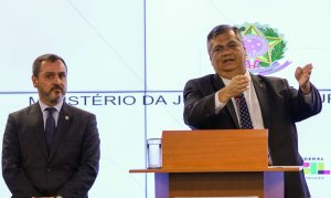 Brasília (DF) -16/02/2023 0 ministro da Justiça, Flávio Dino, acompanhando do diretor-geral da Polícia Federal, Andrei Rodrigues, durante coletiva