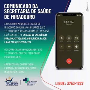 A Secretaria Municipal de Saúde de Miradouro comunica aos usuários que o telefone do plantão 24 horas (32) 3753-1249 está com defeito.