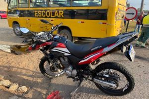 Um motociclista ficou ferido na manhã desta segunda-feira (10) após colidir com um ônibus escolar da Prefeitura de Muriaé com alunos dentro, na BR-116, na altura do trevo do bairro Gaspar.