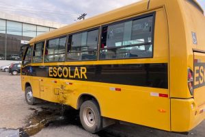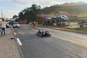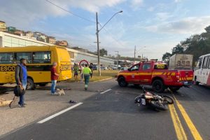 Um motociclista ficou ferido na manhã desta segunda-feira (10) após colidir com um ônibus escolar da Prefeitura de Muriaé com alunos dentro, na BR-116, na altura do trevo do bairro Gaspar.