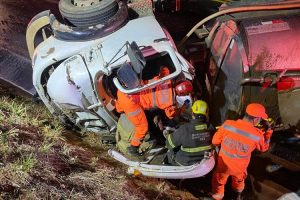 O veículo ficou tombado lateralmente e o condutor preso as ferragens, sendo necessário a equipe do Corpo de Bombeiros usar instrumentos para retirá-lo.