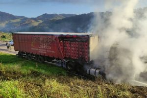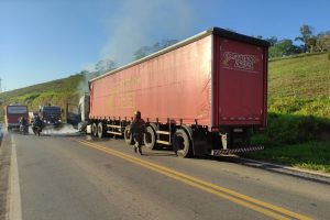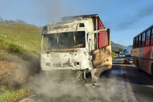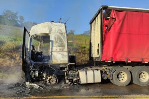 Uma carreta carregada de cerveja pegou fogo na manhã desta terça-feira (19) após descer a Serra de Pirapanema na BR-356. Ao passar próximo ao distrito de Vermelho, o motorista percebeu as luzes do painel se acendendo. Ele parou para ver o que era e quando saiu da cabine, percebeu o veículo já em chamas.