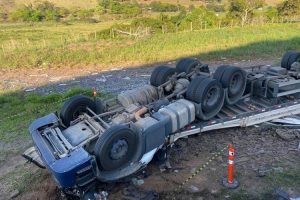 (Matéria atualizada às 10h) Uma carreta carregada com chapas de vidro tombou nesta segunda-feira (25) na BR-116, em uma curva na altura do distrito de Itamuri. Luciano Simões de Souza tinha 46 anos. Atrás dele estava outro carreteiro que trabalhava na mesma empresa que ele.