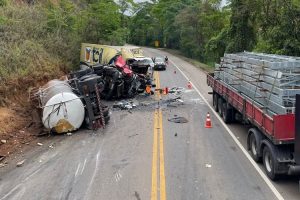 Uma carreta carregada de açúcar em líquido perdeu o controle em uma curva na BR-116 na altura da Serra de Belvedere e bateu de frente com um caminhão carregado de móveis.