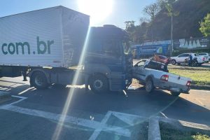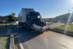 Um acidente envolvendo uma caminhonete e uma carreta foi registrado na tarde desta quinta-feira (09) no trevo da Chevrolet, entre as BR’s 116 e 356.