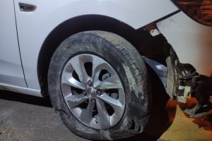 Uma das viaturas durante patrulhamento pelo bairro São Pedro localizou o veículo com alguns danos na parte dianteira e com um dos pneus da frente lado direito estourado.
