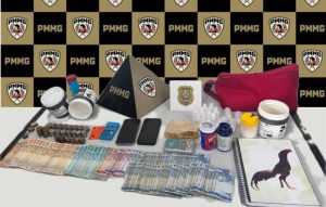 * Drogas: Foram apreendidas substâncias análogas à pasta base de cocaína, cocaína em pó, e um pote de Pó Royal com substância branca.