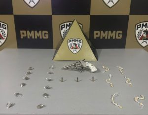 Durante as buscas, os militares localizaram um revólver calibre .22 municiado, além de porções de drogas já fracionadas para comercialização.