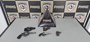De imediato, as equipes deslocaram-se até o local, onde lograram êxito em localizar o suspeito. Durante a abordagem e após parlamentação, foram encontradas e apreendidas *três armas de fogo*, sendo: